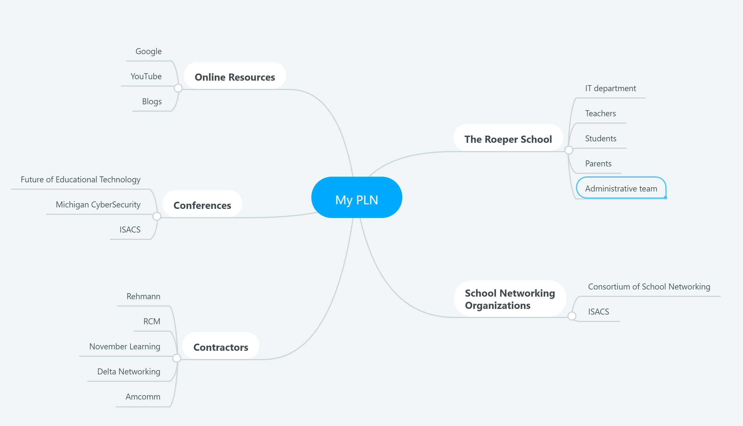 I am a very independent person, and I tend to prefer to find solutions for problems on my own. I like people, but most of the time I prefer to be in my own mind. When I began creating my PLN diagram, I thought it might only contain myself and some Google web searches. But I found that I use my PLN much more than I thought. I was surprised to all the people with which I connect. I interact with many different groups, and we work together well. When I looked at the diagram, I realized I had created my own PLN over the years without knowing it.