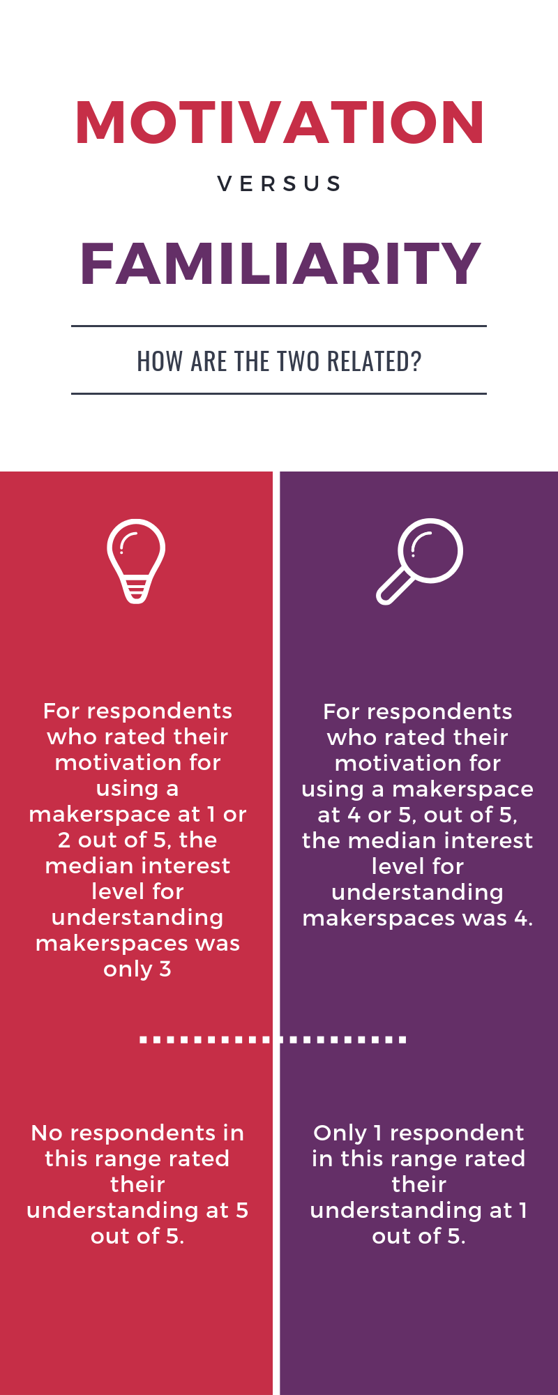 This could be just because people who are more motivated will naturally want to learn more about what a makerspace is. However, many of the people who were less motivated cited obstacles such as “I don’t know what to do with it.” This was the most common response to the biggest obstacle to using a makerspace.